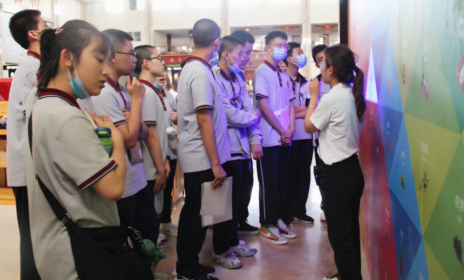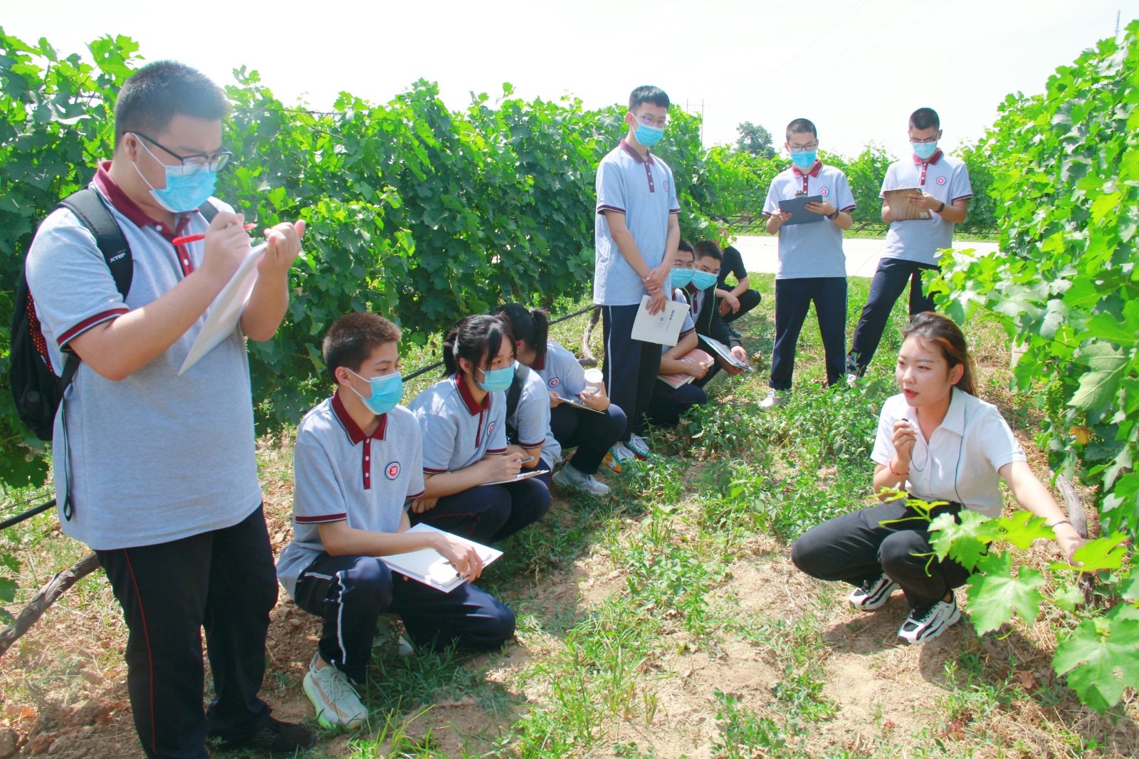 剛進(jìn)入莊園,同學(xué)們就被這里千畝葡萄園的秀美風(fēng)光吸引了,跟著講解員一起了解葡萄種植全過程以及釀酒葡萄品種等知識(shí)。