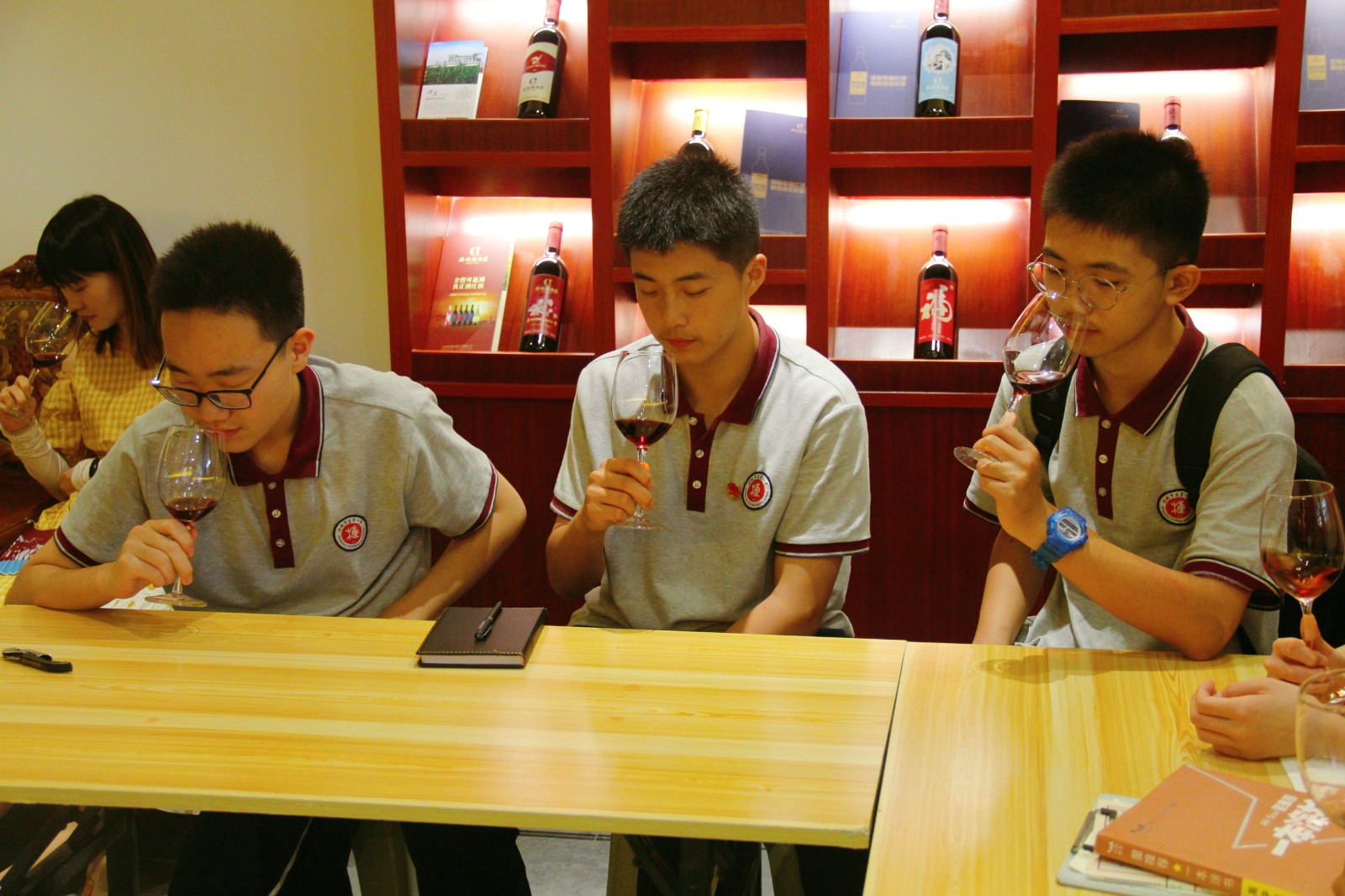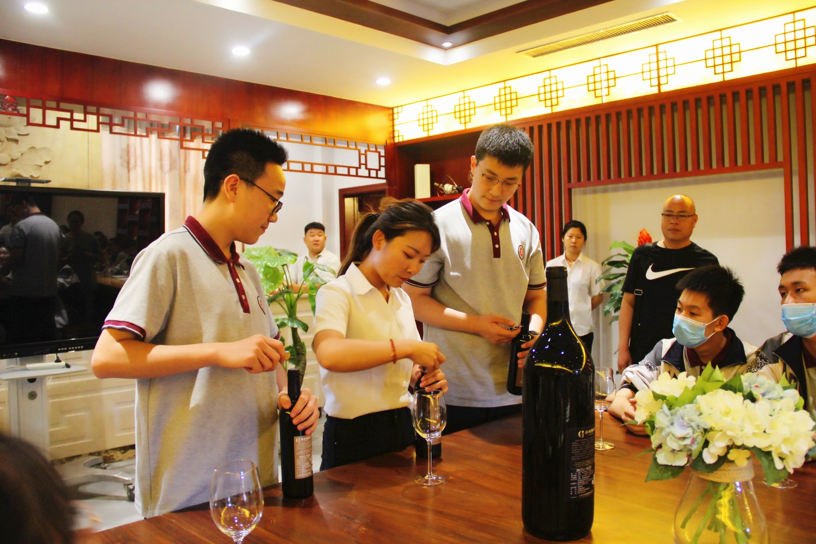 在參觀地下音樂酒窖之后,同學(xué)們進(jìn)入中式品鑒室,在專業(yè)品鑒師的帶領(lǐng)下,學(xué)會(huì)了如何正確開酒、倒酒,了解了品酒三部曲和正確的持杯、碰杯的姿勢(shì)。品味醇美紅酒,弘揚(yáng)紅酒文化,感受歷久彌新的紅酒魅力。