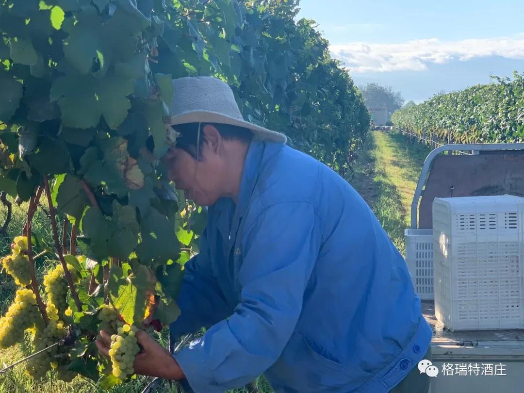 8月23日,天晴的像一張藍(lán)紙,幾片薄薄的白云,像被陽(yáng)光曬化了似的,隨風(fēng)緩緩浮游著,就是在這樣一個(gè)如詩(shī)如畫(huà)的日子里,格瑞特酒莊一年一度的葡萄采收工作正式拉開(kāi)了帷幕。最先和我們見(jiàn)面的霞多麗葡萄,在柔和的陽(yáng)光下,顯得格外美!